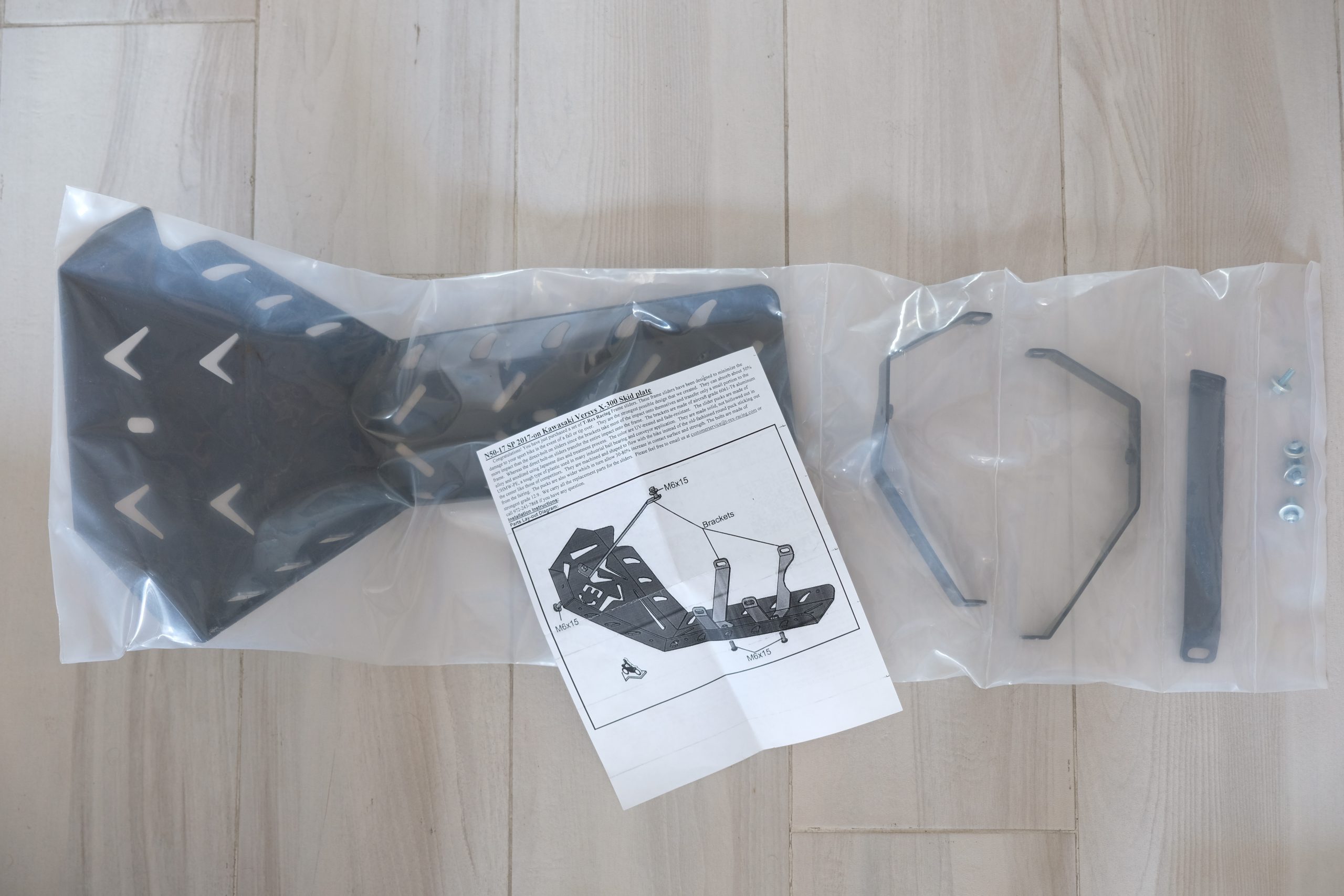 The skidplate is well-packed in a rather large box. All parts are sealed separately in a bag. The whole kit is comprised of the skidplate, 3 mounting brackets and 4 bolts with washers.