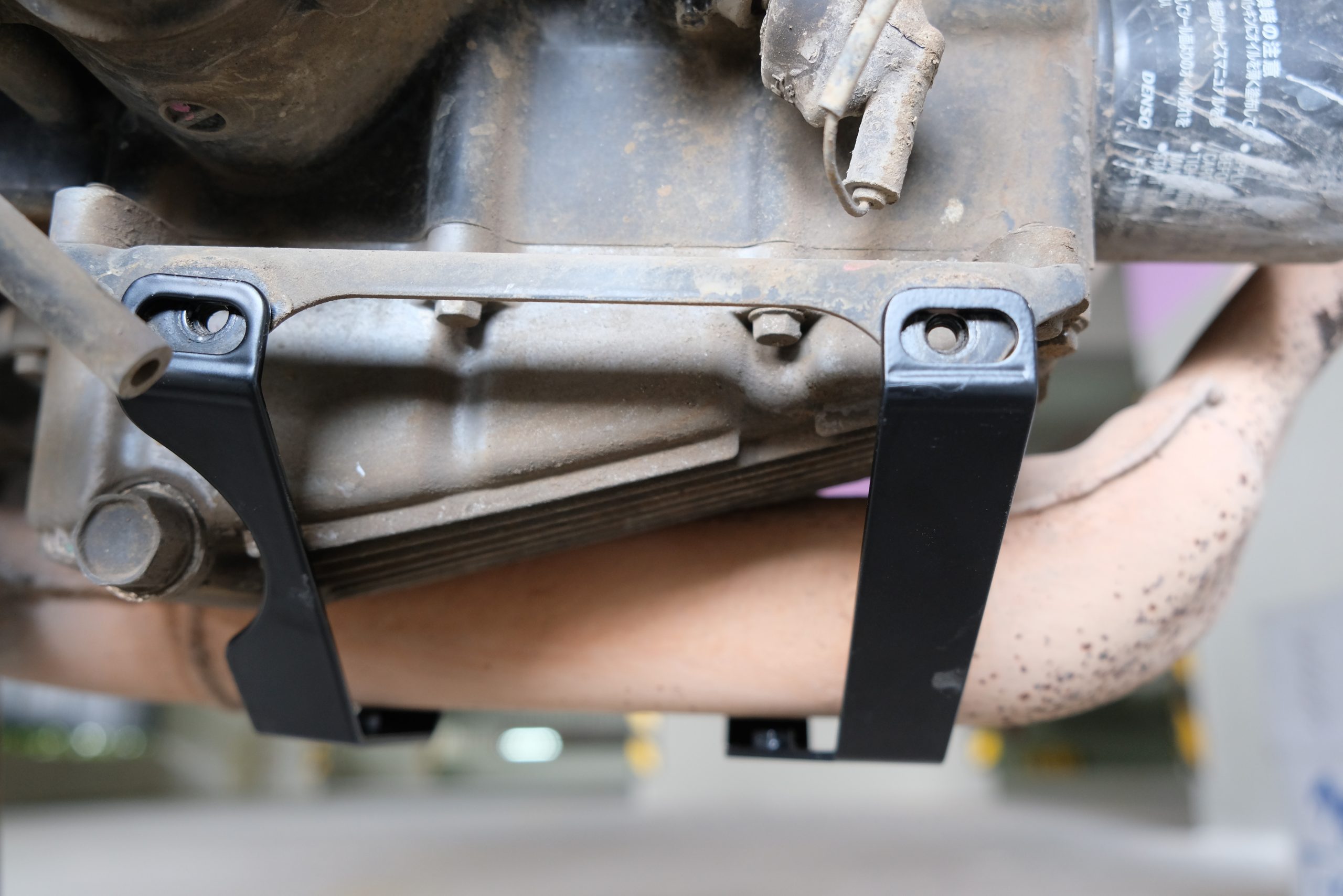 The third (and last) mounting bracket is positioned above the oil filter, as you can see on the picture below. You need to use the longer bolt, supplied in the kit. Once the 3 mounting brackets in place, you can start bolting everything up.