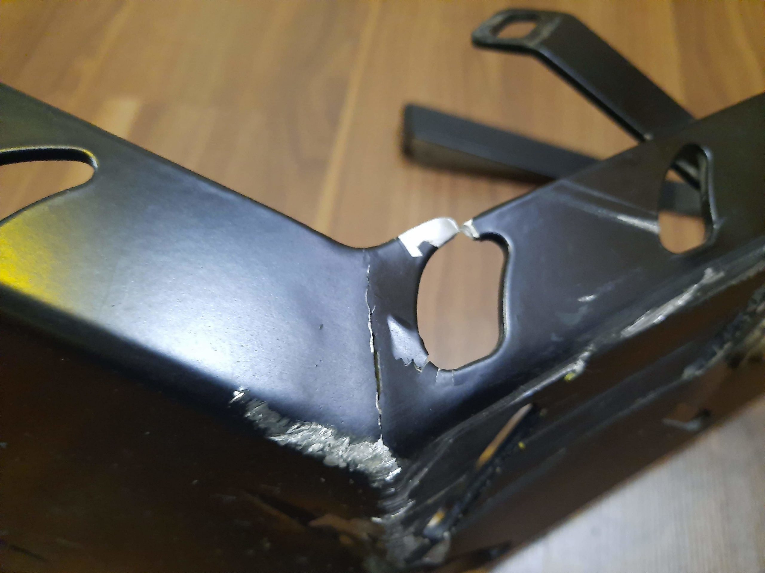 Due to the severity of the impact, the main welds failed. The mounting brackets bend and allowed the whole plate to shift backwards by 3-4 cm, causing it to hit the exhaust pipes. However, the exhaust pipes escaped unscatched from the incident!